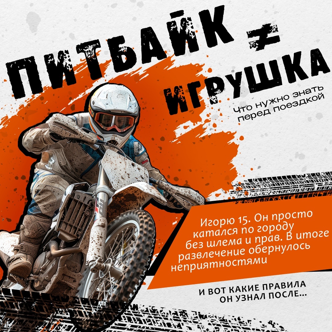 Ездить на питбайке можно только на специализированных закрытых трассах и спортивных площадках, передвигаться на нем по дорогам общего пользования, а также по обочинам и тротуарам запрещено.