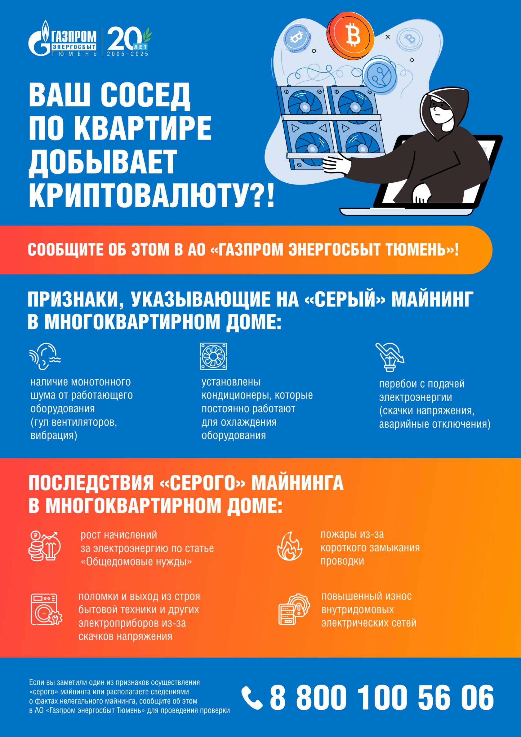 При обнаружении признаков «серого» майнинга можно обратиться в АО «Газпром энергосбыт Тюмень» по телефону 8-800-100-56-06. По факту обращения сотрудниками Общества будет организована проверка.