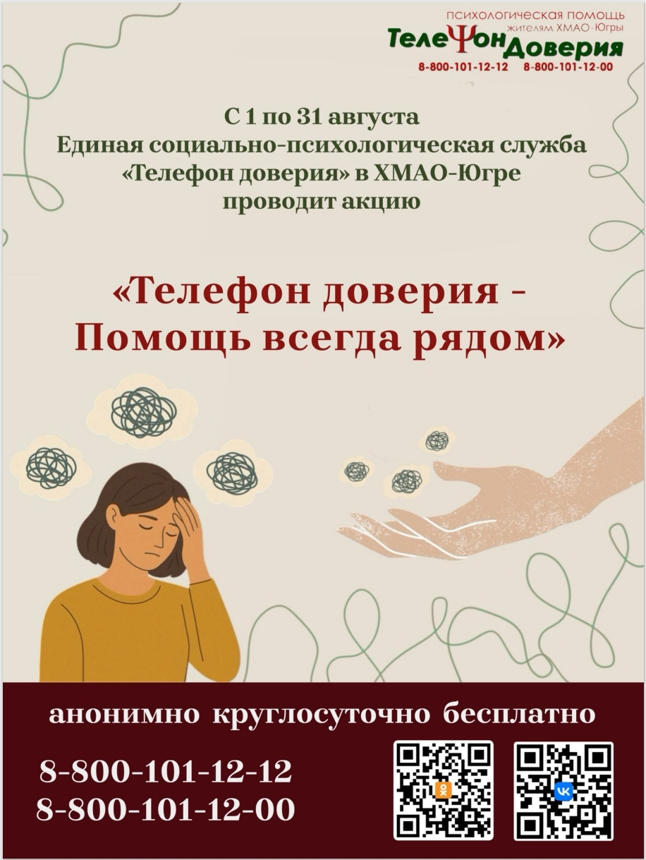 1 августа 2025 года в Ханты-Мансийском автономном округе - Югре стартовала акция «Телефон доверия - Помощь всегда рядом», направленная на информирование граждан о деятельности Телефона доверия - экстренной психологической помощи. Акция пройдет с 1 по 31 августа 2025 года.